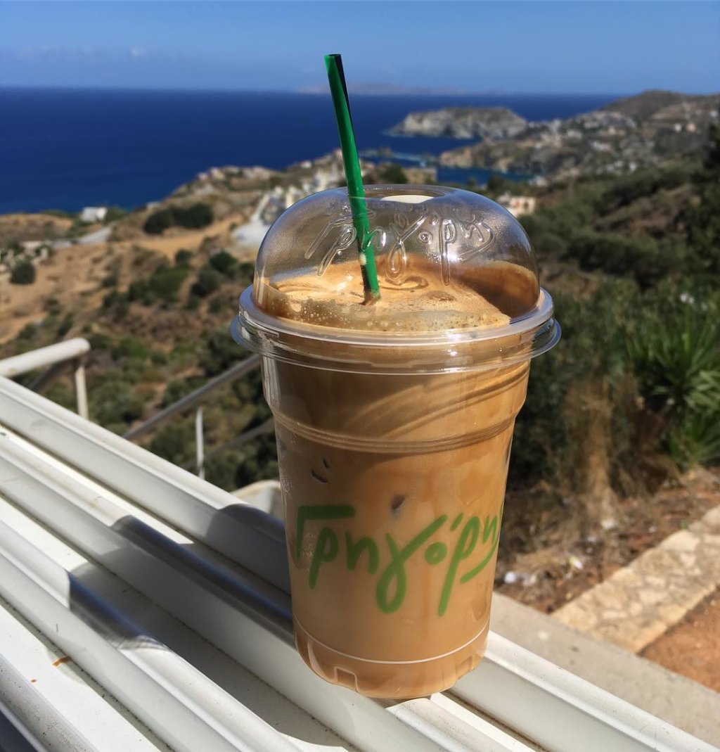 Have not had frappé for 10 years. It's sort of a crime against mankind but feels very appropriate in Greece. "Frappé coffee is a Greek foam-covered iced coffee drink made from instant coffee, water and sugar. Accidentally invented by a Nescafe representative named Dimitris Vakondios in 1957 in the city of Thessaloniki."