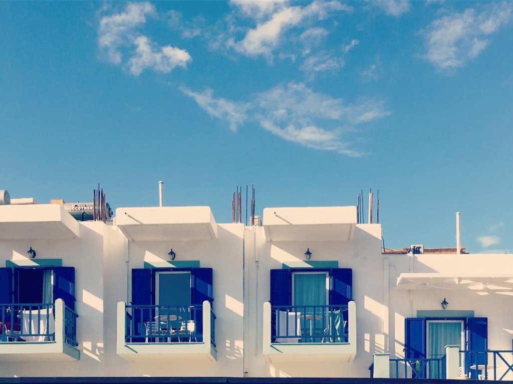 Contemporary greek architecture in one picture: earthquake proof concrete, white and blue paint, never finished top floor, weird plumbing. #greece #architecture #concrete #steel